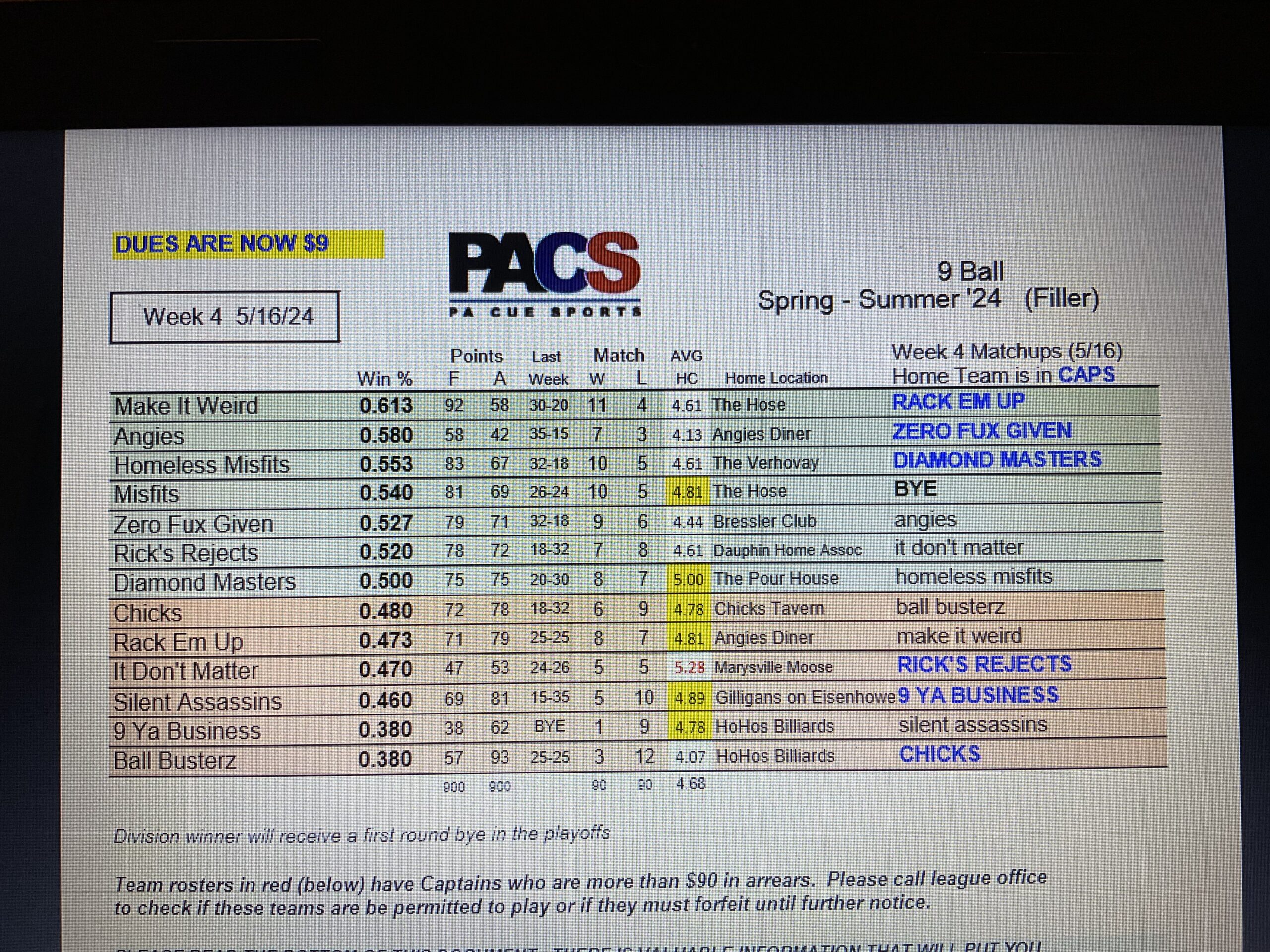 9 Ball Week 4 TEAM Standings (Filler)